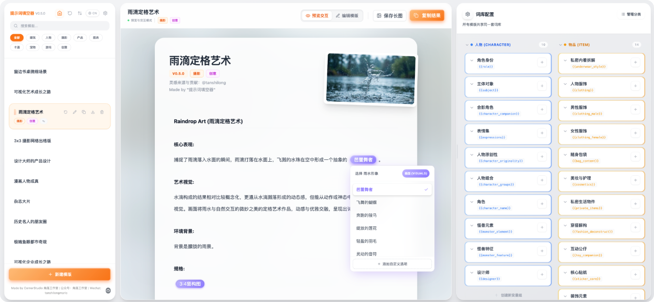 PromptFill内置覆盖电商广告、游戏美术、插画设计等10大行业的专业模板库,包含超过500种艺术风格与12种常用构图模式。同时支持自定义模板保存功能,用户可将个性化配置一键存入个人模板库,实现创作效率3倍提升,为专业创作者提供标准化批量创作解决方案。