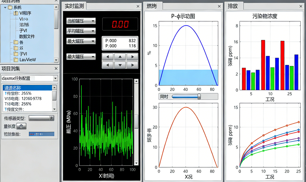 LabVIEW 开发内燃机缸压采集与分析系统,通过整合数据采集卡与传感器,实现缸压、曲轴转角信号采集及燃烧性能、排放等多维度分析,成功支撑 HCCI 燃烧方式实验验证,为内燃机节能与排放优化提供技术支撑。