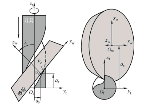 在刀具几何模型中,我们需要将刀刃曲线从刀具坐标系转换到砂轮坐标系,并进行轴向平面投影。理论推导得到两个表达式: