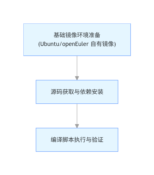 对于需要自定义基础环境的场景,可采用直接编译方式。该方案跳过官方容器镜像,基于自有镜像(如Ubuntu、openEuler)构建环境,架构图如下: