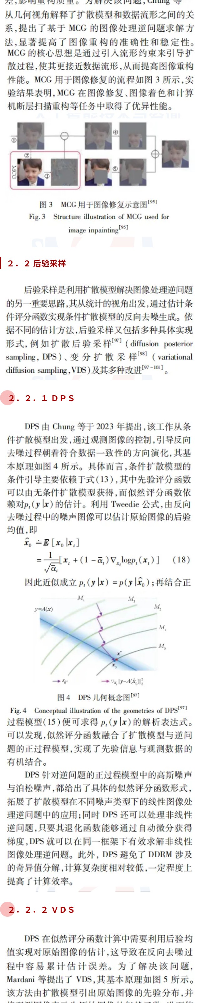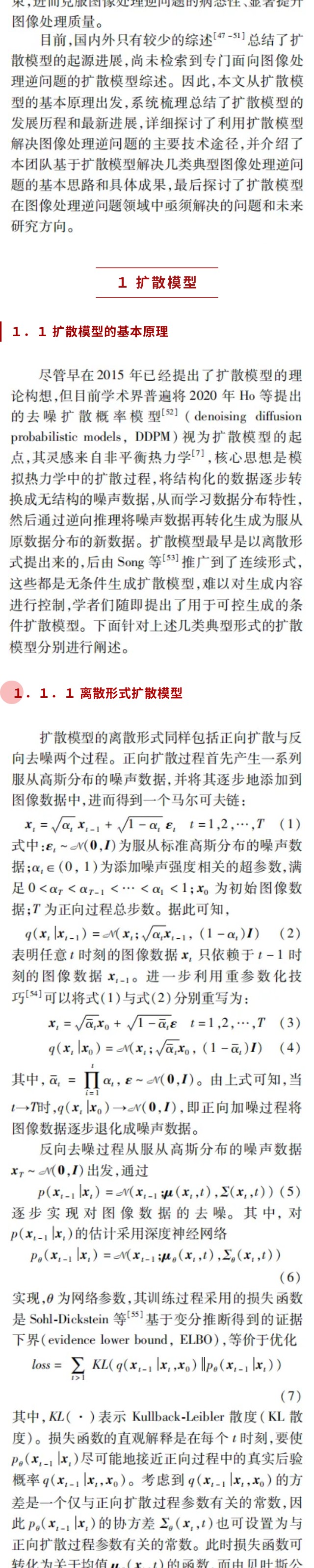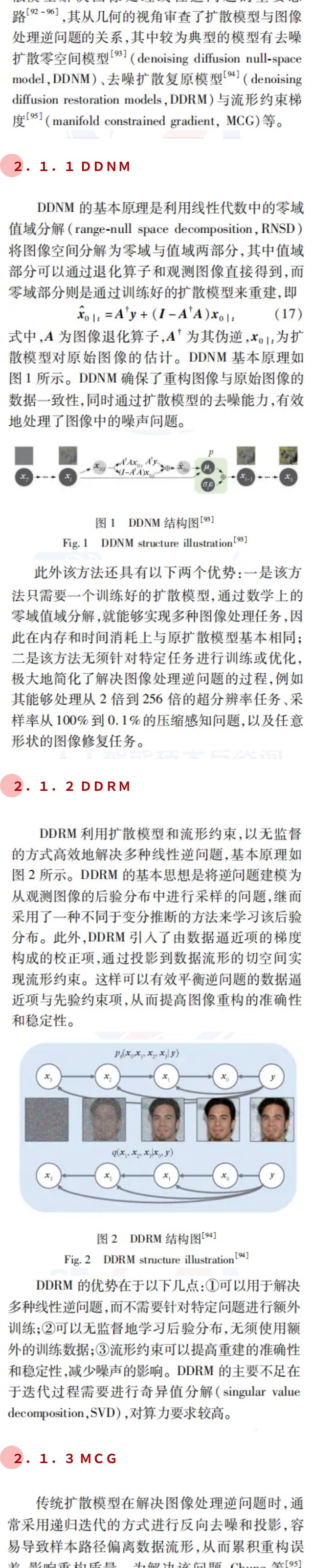 图像处理逆问题(如去噪、超分辨率、修复等)旨在从退化观测中重建原始图像,传统方法常受限于不适定性和先验建模的复杂性。扩散模型作为一种新兴的深度生成范式,通过模拟数据在噪声与信号间的双向扩散过程,为逆问题提供了强大的概率重构框架。本综述系统梳理了扩散模型在图像逆问题求解中的研究进展:首先阐释其基于随机微分方程的理论基础;继而分类讨论基于条件生成、得分匹配等技术的重建方法;最后总结其在医学成像、遥感、计算摄影等领域的应用,并探讨当前面临的稳定性、效率等挑战与未来发展方向。