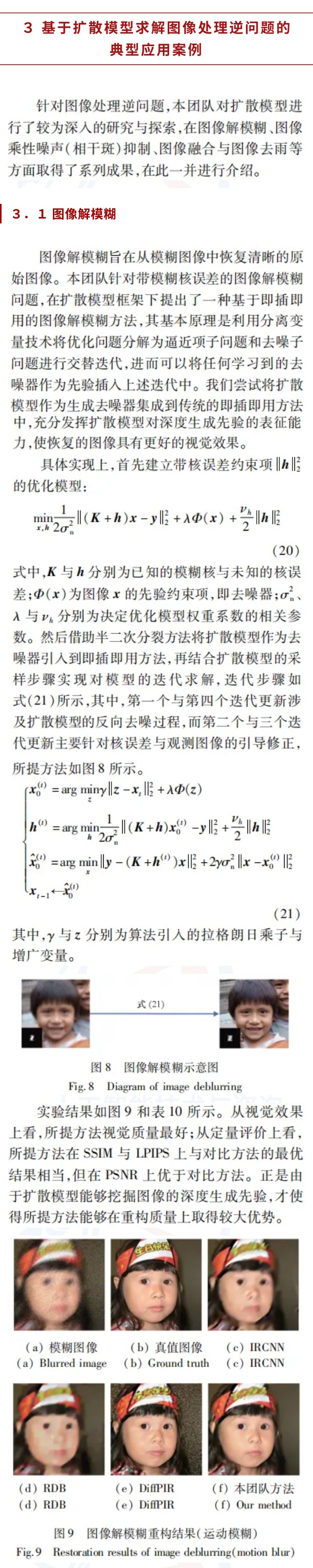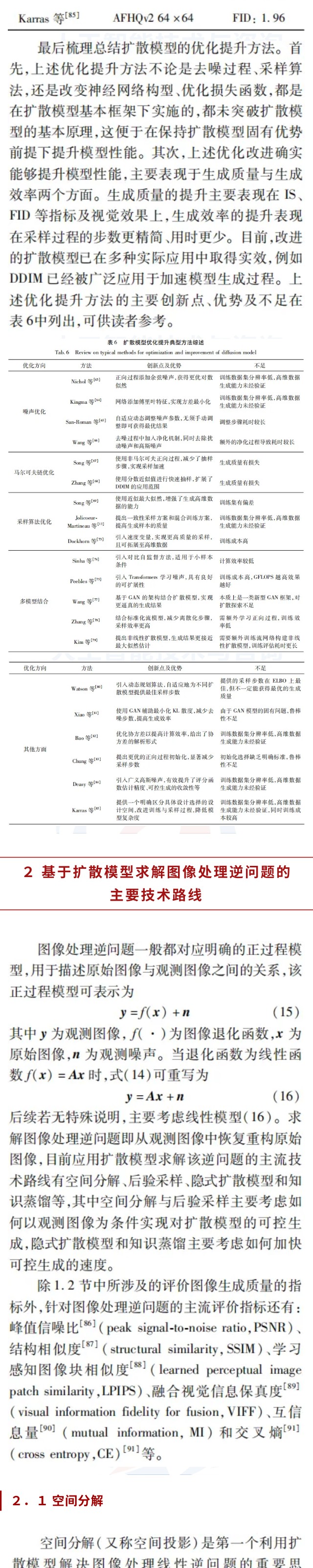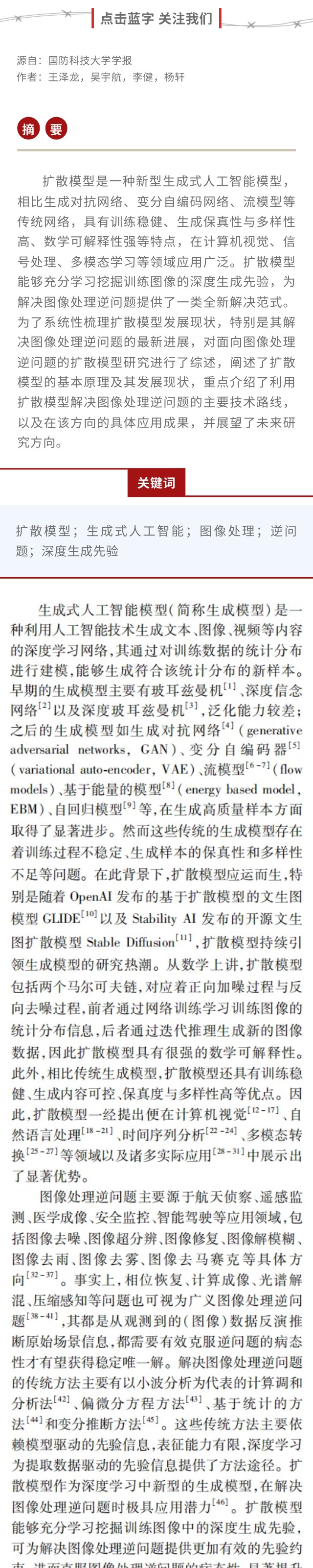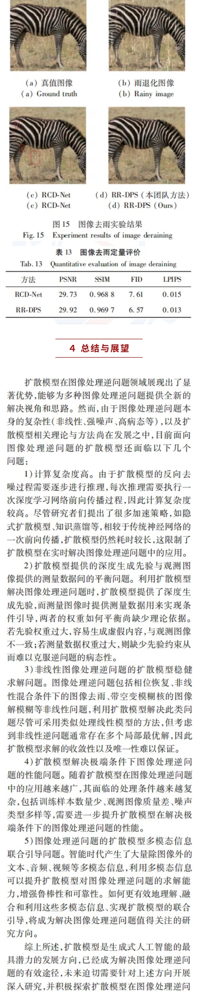 图像处理逆问题(如去噪、超分辨率、修复等)旨在从退化观测中重建原始图像,传统方法常受限于不适定性和先验建模的复杂性。扩散模型作为一种新兴的深度生成范式,通过模拟数据在噪声与信号间的双向扩散过程,为逆问题提供了强大的概率重构框架。本综述系统梳理了扩散模型在图像逆问题求解中的研究进展:首先阐释其基于随机微分方程的理论基础;继而分类讨论基于条件生成、得分匹配等技术的重建方法;最后总结其在医学成像、遥感、计算摄影等领域的应用,并探讨当前面临的稳定性、效率等挑战与未来发展方向。