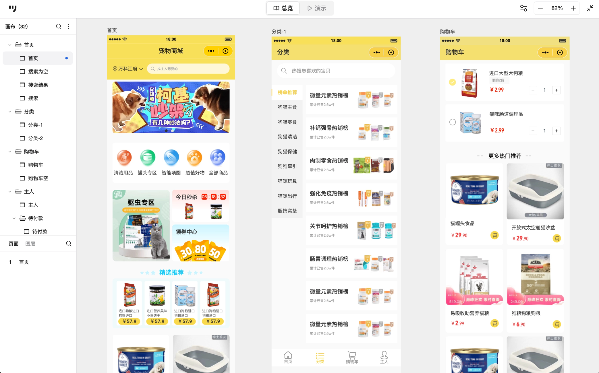 该原型是一个逻辑非常完整的垂直电商APP,包含了从商品浏览、分类检索到购物车结算、个人中心的全套流程。不同于淘宝京东等综合电商,它更强调"宠物属性"。对需要快速搭建宠物类垂直商城系统的产品经理,这个原型的参考价值在于: