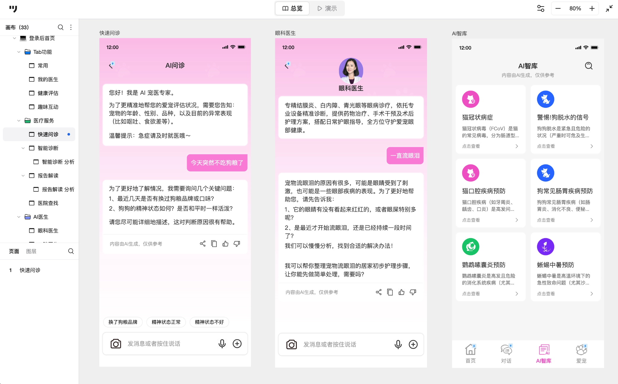 这个宠物医疗问诊APP中的核心是AI技术,整个设计围绕"AI医生对话框"展开,模拟了真实的问诊场景。在做这类原型时,产品经理需要重点要注意: