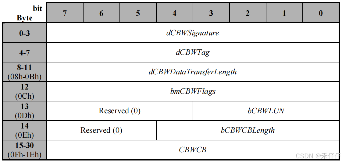 CBW 应该从数据包的边界开始,在正好传输了 31 个字节后作为短包结束。所有后续数据和 CSW 都应该从新数据包的边界开始, CBW 的说明如下表: