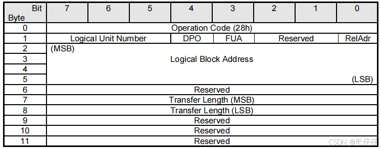 - bCBWLUN :命令块发送的设备逻辑单元号( LUN )。对于支持多个 LUN 的设备,主机应该将该字段设置为命令块寻址的 LUN 。否则应该设置为 0 。对于 U 盘主机系统来说,因为 U 盘都不支持多个 LUN ,因此该字段应该设置为 0 。