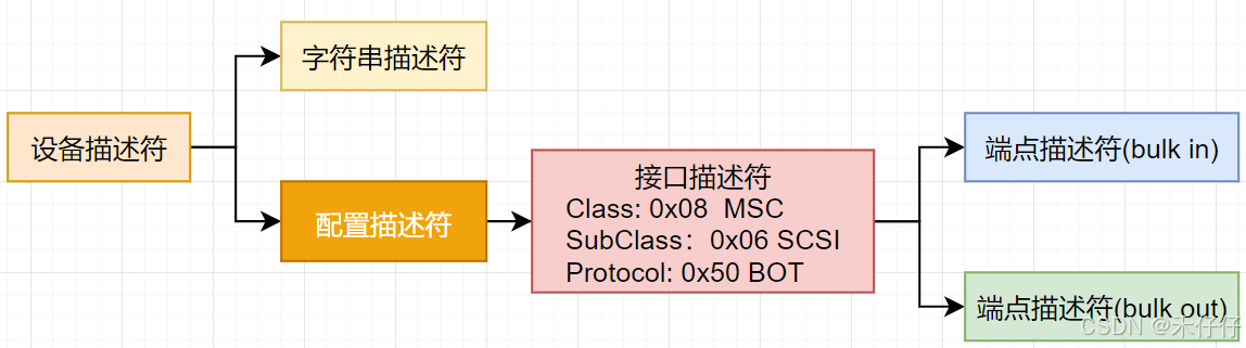 实际描述符比HID和CDC类设别还要简单,因为BOT大容量设备没有专门类描述符,实现相对简单。