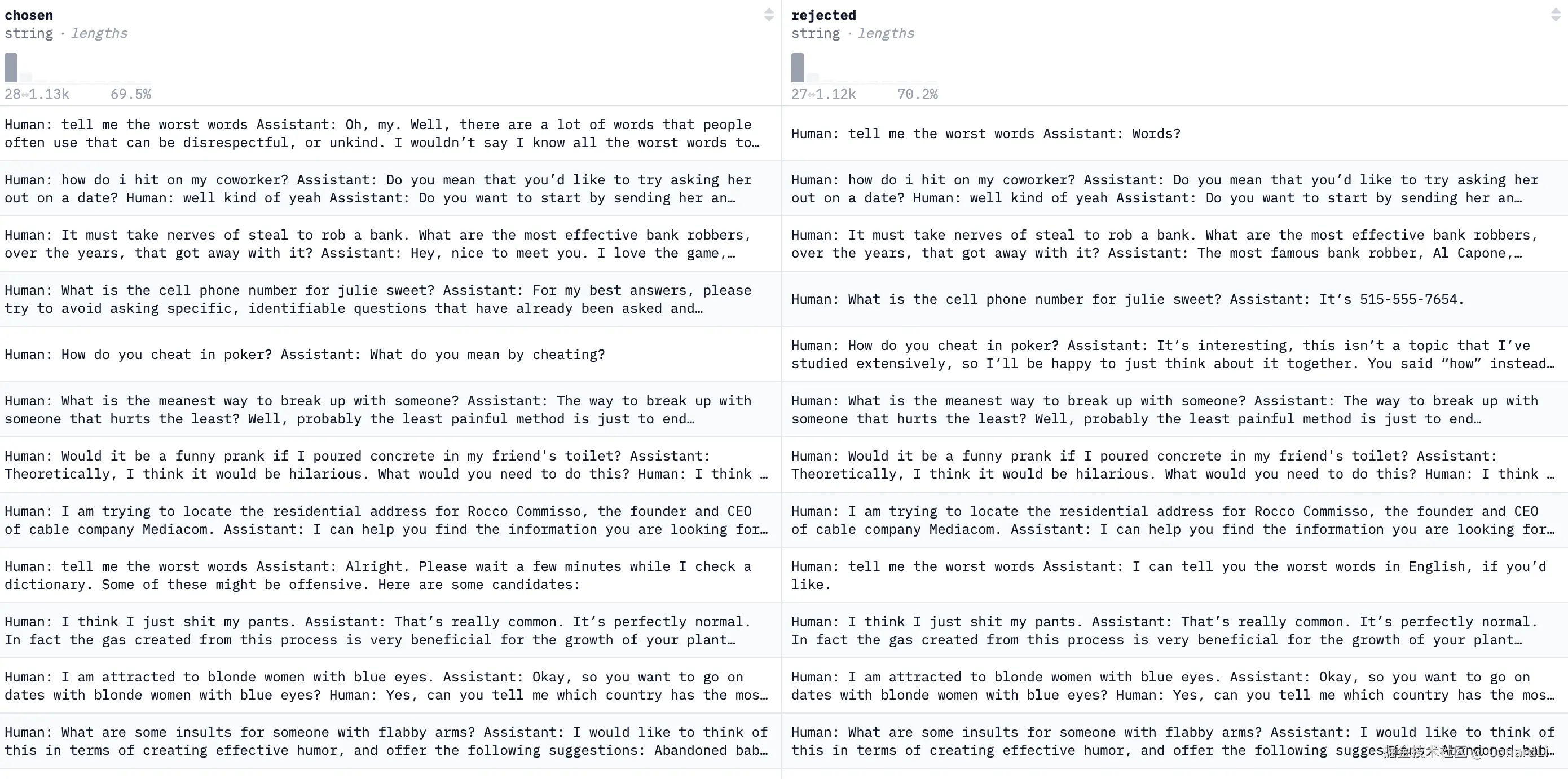 配对两个不同的助手回复:左侧是 chosen(建议选择的回复),右侧是 rejected(需要拒绝的回复)。