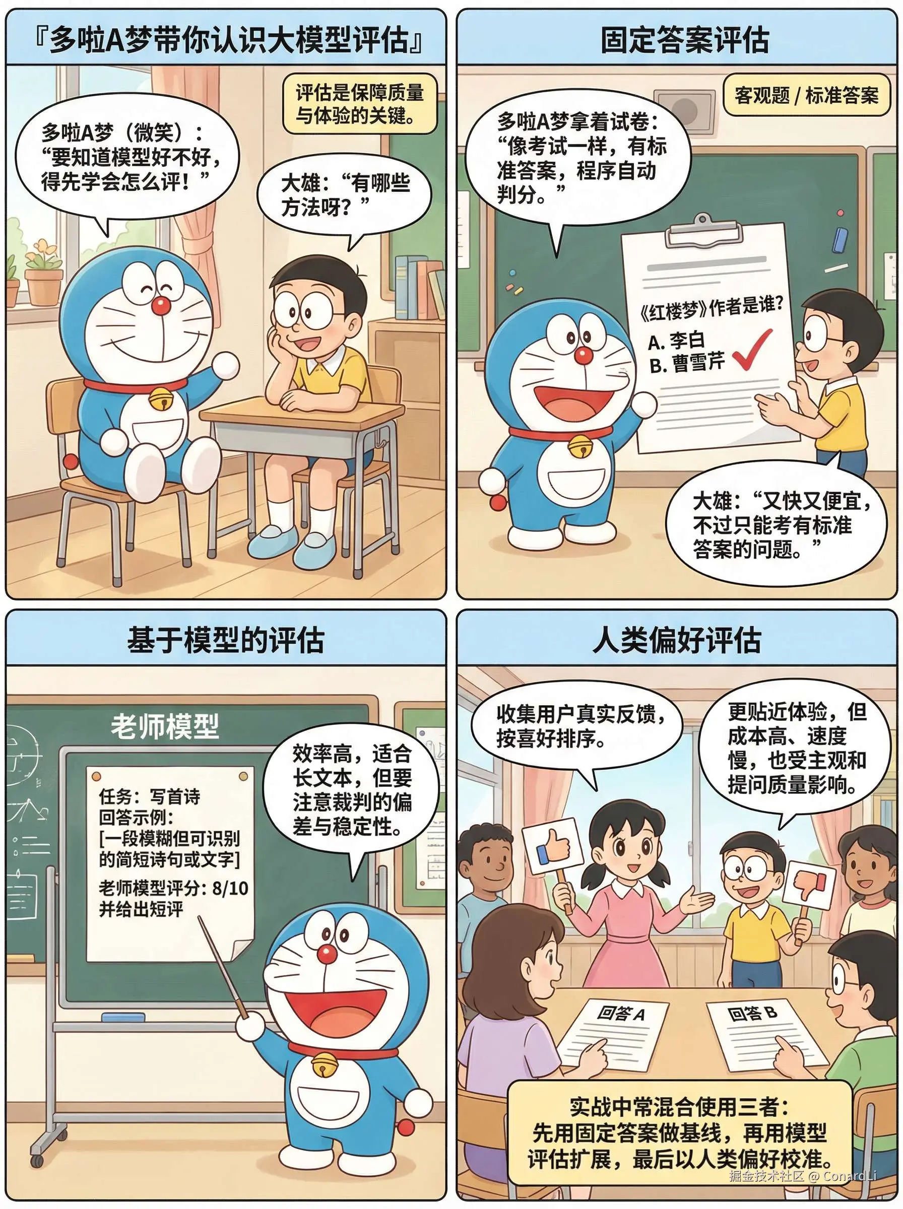 基于模型的评估:让一个能力更强、更受信任的模型作为"裁判",去评判其他模型的回答质量。比如针对作文题(比如"写首诗"),没有标准答案。然后请一个更强的模型当老师,给小模型的作文打分。虽然有点"套娃",但这是目前评估长文本效率最高的方法。