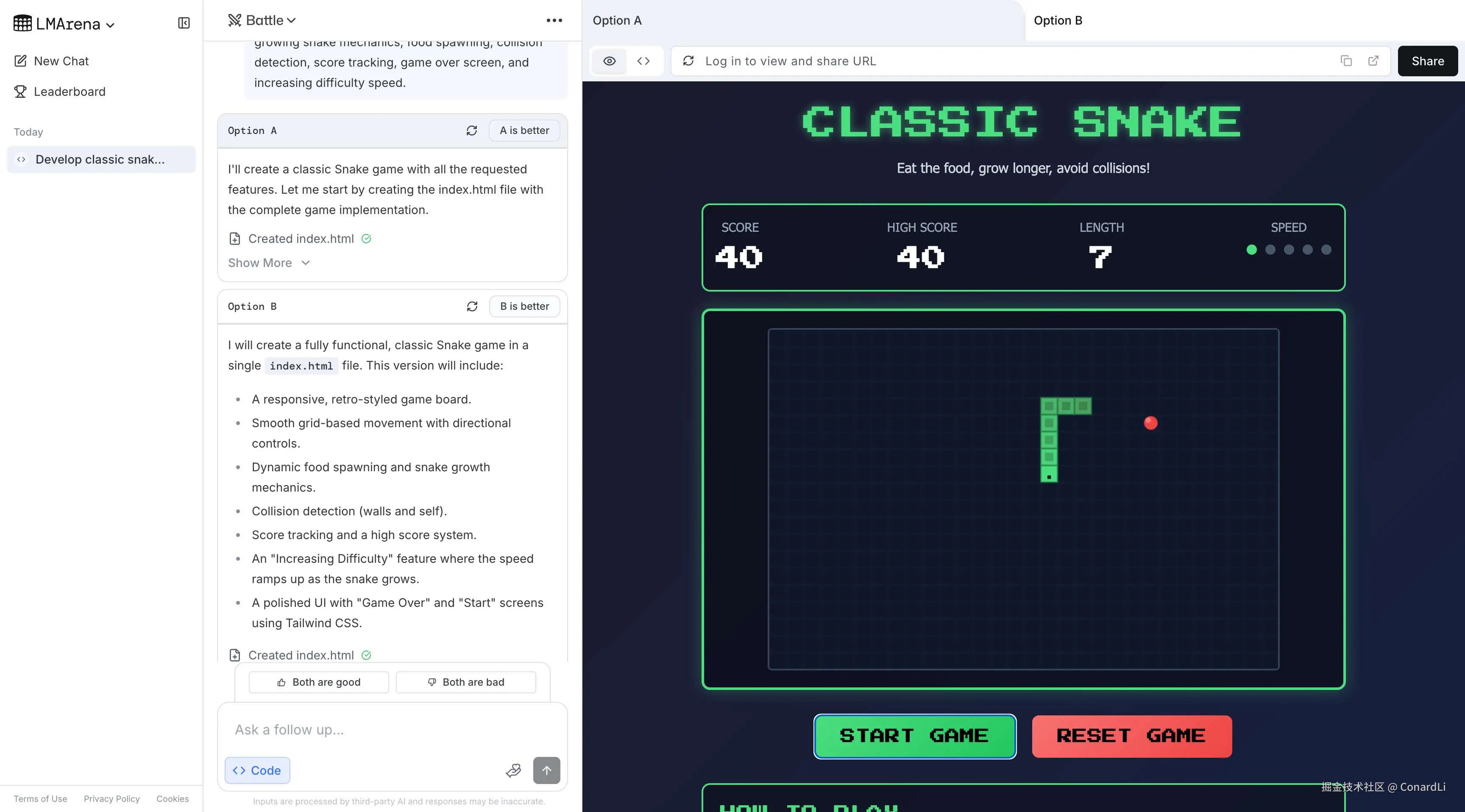 然后系统会随机派两个模型来回答这个问题,此时你完全不知道谁是谁,只显示 A 和 B。