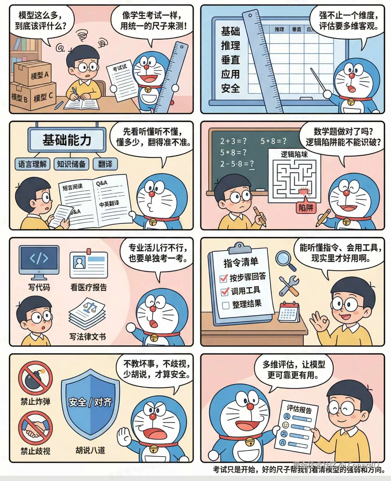 想象一下,如果没有标准化的考试,我们怎么知道一个学生学得怎么样?是让他即兴来一段 freestyle,还是解一道老师自己都可能做错的奥数题?这两种方式都有用,但都不够全面和公平。大模型的评估也是一个道理。