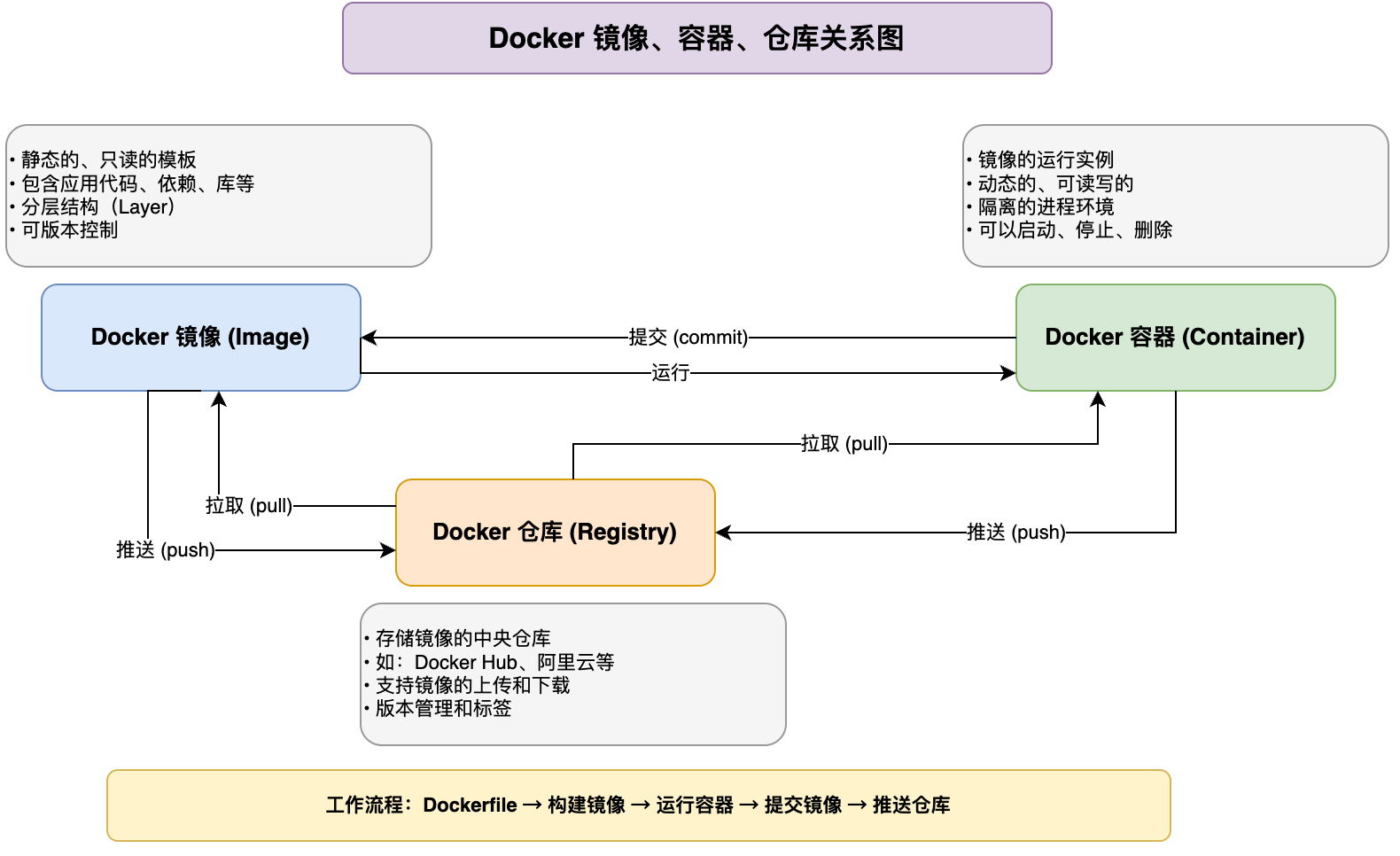| 镜像(Image) | 只读模板,包含应用运行所需的所有内容 | 安装光盘/ISO文件 |
