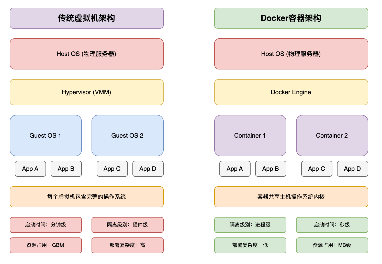 工作这么多年以来,接触运维还是停留在七八年前,那时候刚进入一个创业公司,作为一名后端开发,有些时候还是会接触到服务器,在黑窗窗里敲一些命令。后来,去到的公司职能都划分的比较清晰,前端、后端、运维,所以我的运维记忆还停留用VM虚拟机学习安装各种软件环境。现在回到二线城市工作,开发需要全面,前端、后端、运维你都会是最好的。所以,我开始学习使用Docker了。Docker是什么,如果你和我一样,也接触过用VM虚拟机学习运维,那么下面的对比图就很清楚两者的区别了。