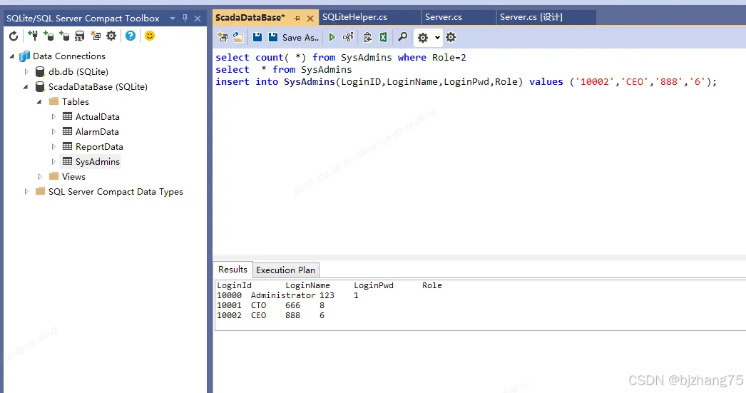 string sql1 = "insert into SysAdmins(LoginID, LoginName, LoginPwd, Role) values('10006', 'CFO', '008', '9')";
