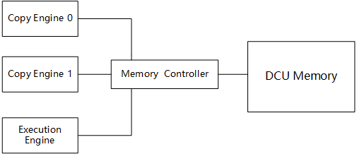 DCU加速器根据其主要功能可以划分为四个主要组件:执行引擎(Execution Engine),一个或多个DMA拷贝引擎(Copy Engine),内存控制器(Memory Controller)和DCU显存(DCU Memory)。 DMA拷贝引擎可以接收内存控制器的数据传输请求,处理系统内存与DCU显存之间、DCU显存之间的传输数据。 由于PCI-E是全双工的互连协议,DCU加速器拥有2个拷贝引擎,可以同时进行数据传入和数据传出的双向通信。 合理利用DCU加速器各组件的执行特点将大幅度提高程序的性能。