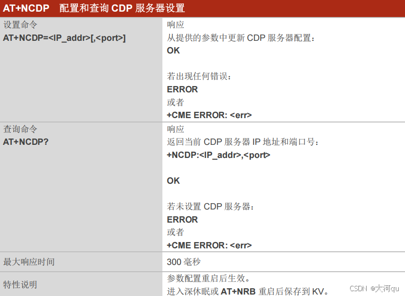 参数 <IP_addr> 字符串型,为 LwM2M 物联网平台 IP 地址,支持 IPv4、IPv6 类型的 IP 地址或域名。参数 无符号整型,取值0~65535,默认值为 5683。若配置端口为 0,则使用默认端口;若没有指定端口,则使用之前设置的端口;若没有指定端口且之前未设置,则使用默认端口。特别要注意的是,参数配置后要重启模组才能生效,重启、要重启, 在重启前,新配置不会生效,即使你在配置CDP时,立即返回了OK。还要理解到,此参数会被自动保存到KV中。