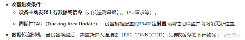 解析:PSM(Power Saving Mode)是一种深度休眠模式,设备在PSM期间会关闭射频模块,无法接收任何下行数据。网络会将待发送的数据临时缓存在核心网(如AMF/UPF),直到设备主动唤醒。