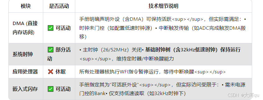 Standby-待机模式通常保留部分功能以确保快速唤醒和必要操作。Standby电流典型值 1--2 μA。其节能原理: 芯片通过关闭高频时钟、处理器及外设电源域,仅保留必要唤醒路径,实现超低待机功耗。此设计保障了NB-IoT设备10--15年电池寿命。