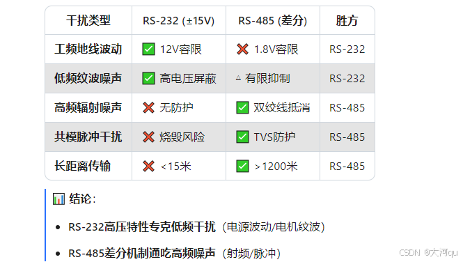 频辐射噪音)、传输距离和多节点通信上全面超越RS-232,但RS-232在特定场景仍具有不可替代的优势。存在即合理:当技术满足 V=(够用+便宜+易用) 时,无需被更先进技术替代。正如螺丝刀未被电动工具淘汰,RS-232在短距、点对点、强(相对高压)干扰场景仍是优选方案。对于具体的干扰类型,两者表现如下,