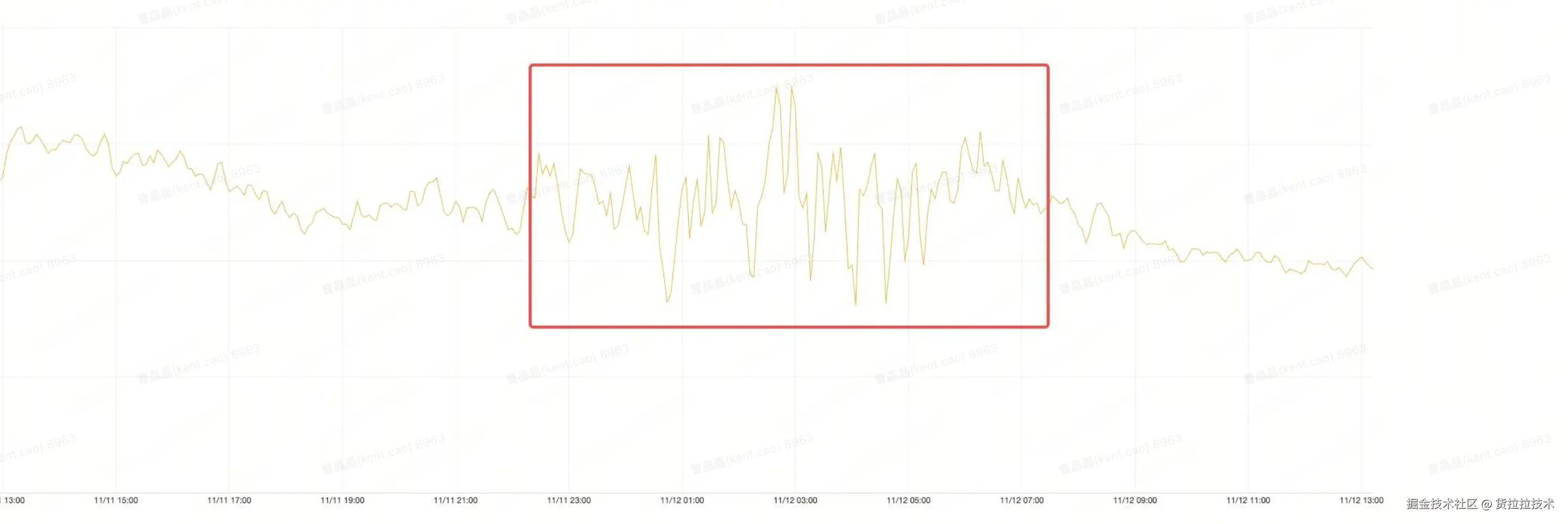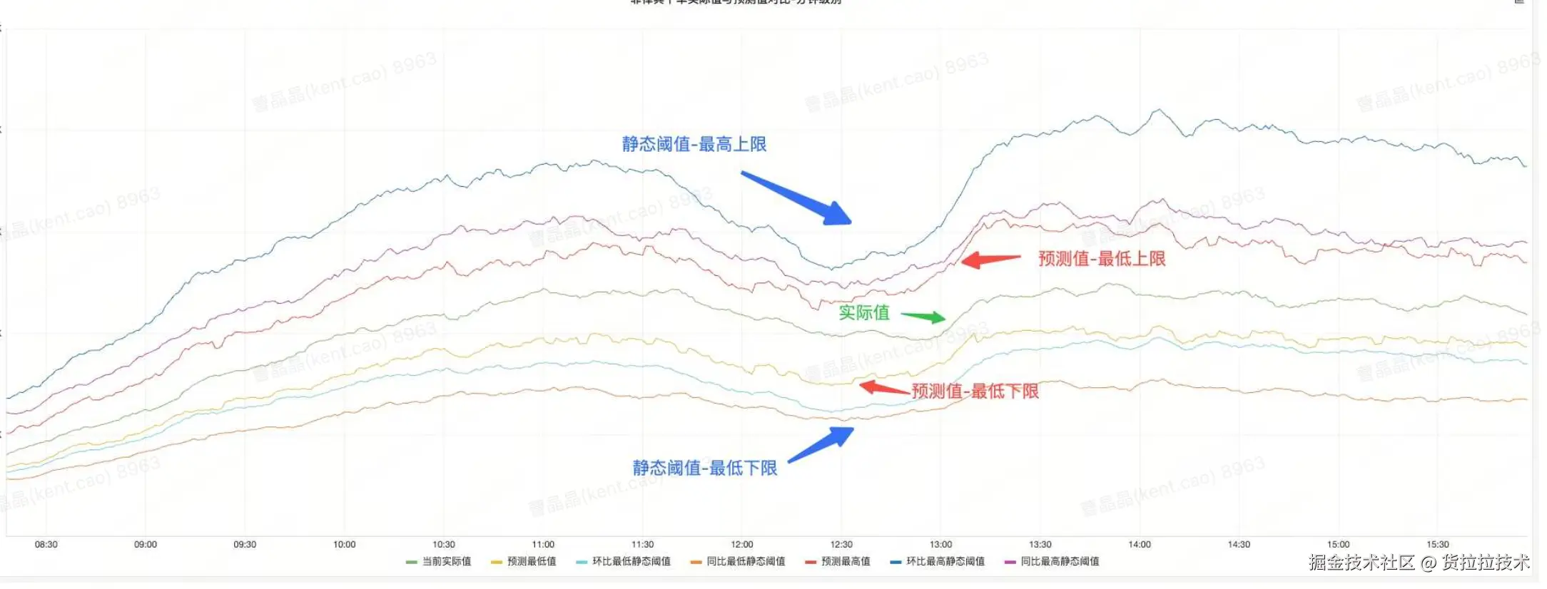 - 模型误差率 :在模型的训练上,我们追求高精准度,从上面模型准确率的统计数据来看,整体能达到94%,但仍有6%,节假日也有近20%的误差率。但对于线上告警系统来说,就仍然有几率出现噪音。如下图所示,预测值会在实际值上下小范围波动。