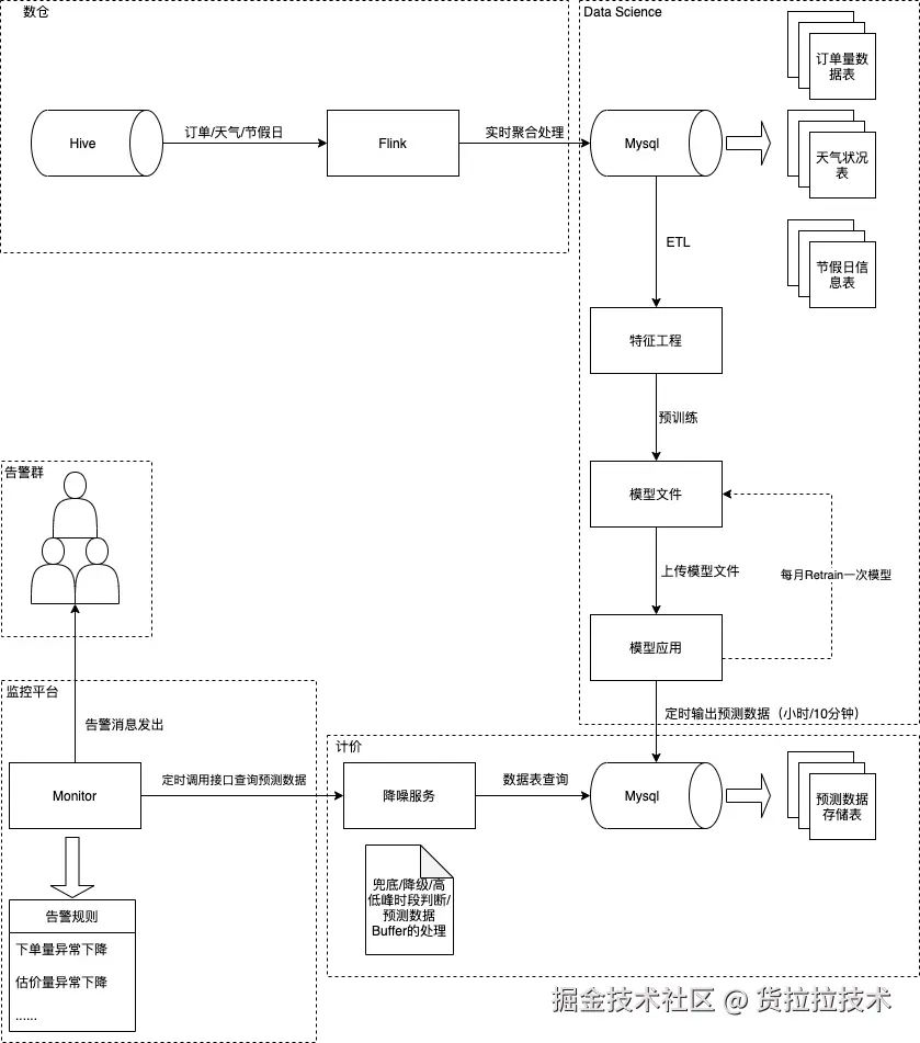 基于历史数据以及机器学习技术训练Lalamove单量预测模型,结合实时订单量,天气,节假日等信息,预测接下来一个10分钟的最低订单量。以此来区分固定阈值无法判断的正常波动。