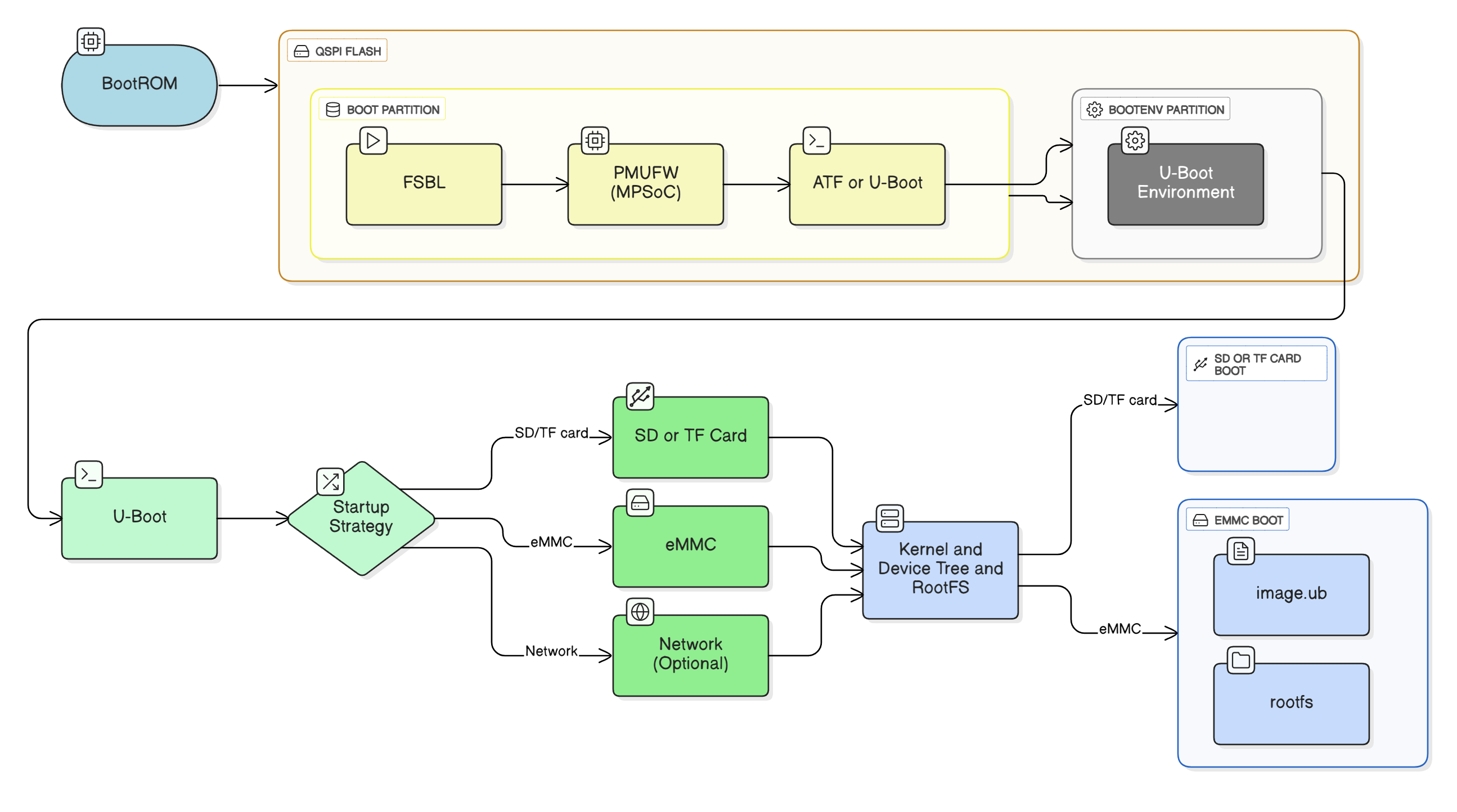 本方案用于 ZYNQ / ZYNQ MPSoC 平台,在 QSPI Flash 固定存放 BOOT.bin 的前提下,通过 U-Boot 引导 SD 卡或 eMMC 中的 Linux 系统镜像 ,并支持在工程现场通过 U 盘完成系统升级。