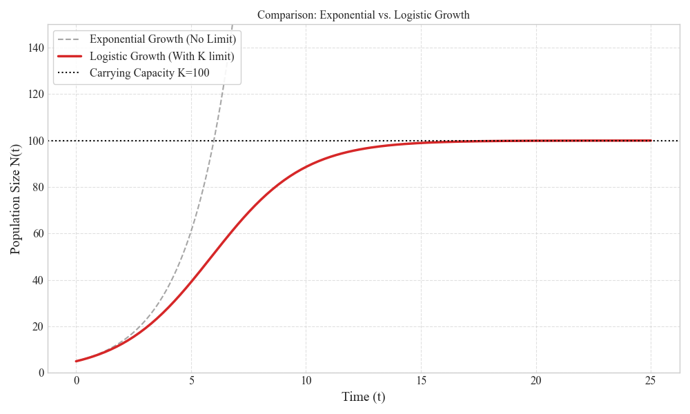 关于生长曲线,不妨模拟一个种群从极少数量(N0)开始的生长过程。为了直观对比,设定相同的初始增长率(r),唯一的区别在于是否引入环境容量限制。在指数模型中,设定环境资源无限,种群仅受自身繁殖能力的驱动,呈现"J型"爆发式增长;而在Logistic模型中,我们设定了一个固定的环境天花板(K),该参数模拟了有限的空间或食物。随着种群数量接近KK值,增长速度被数学项 (1−N/K) 逐渐"刹车"直至归零,从而迫使曲线呈现出经典的"S型"稳定状态。