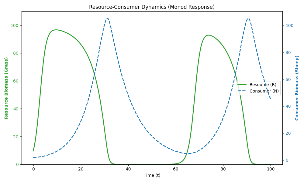这段设定的核心在于打破了"资源是固定常数K"的假设,按照第一篇原理讲解时的比喻,将草(资源R)和羊(消费者N)都视为随时间变化的动态变量。我们设定草自身遵循Logistic恢复规律,但会被羊消耗;而羊的摄食行为不再是简单的线性关系,而是引入了机制:设定了半饱和常数(Ks)和最大摄食速率(Vmax)。这意味着,即使草极度丰富,羊的进食速度也有生理极限(即吃饱了),不会无限增加。这种设定更符合真实的生物学机制,模拟了消费者数量如何严格受限于资源的再生速度和自身的消化能力,最终两者在动态中达到某种生态平衡。