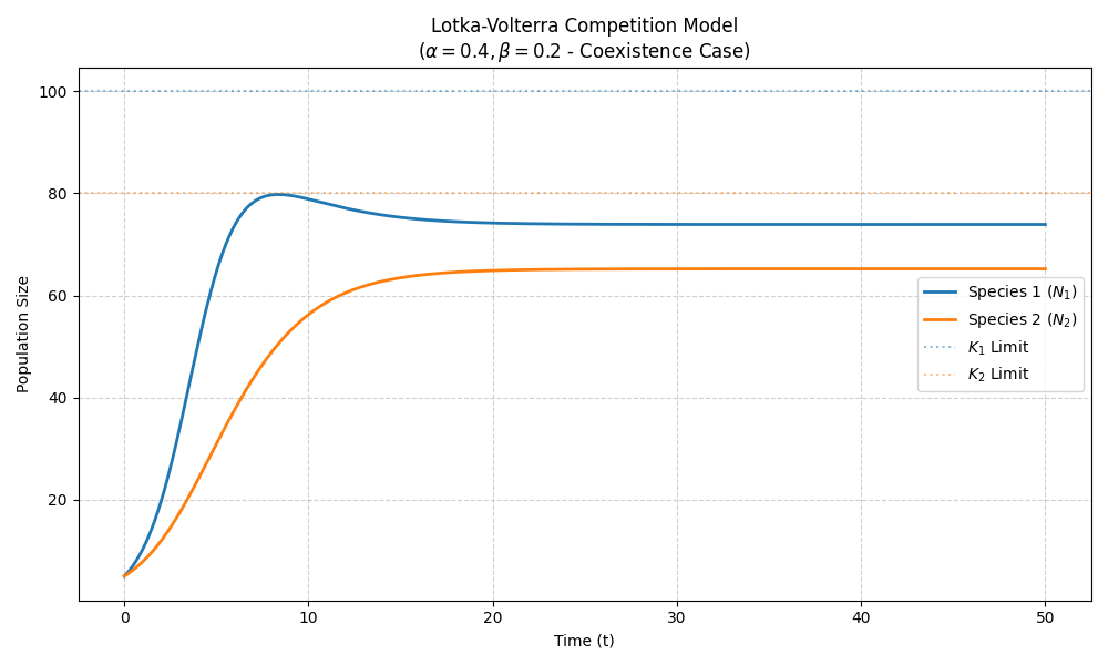 ax.set_title(f'Lotka-Volterra Competition Model\n($\\alpha={alpha}, \\beta={beta}$ - Coexistence Case)')