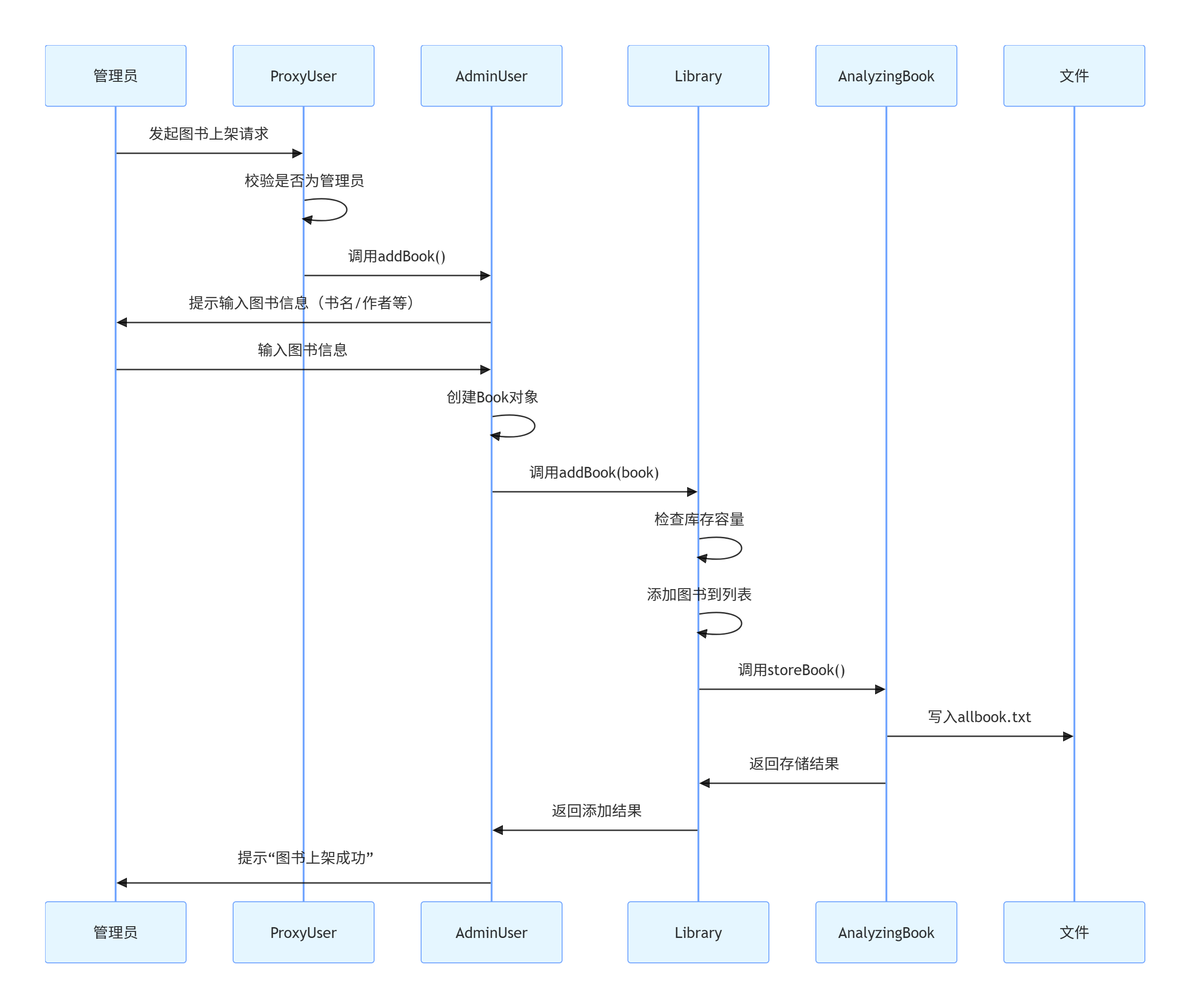 (5)AdminUser借助LibrarySingleton调用Library.addBook(),将图书信息加入内存列表;