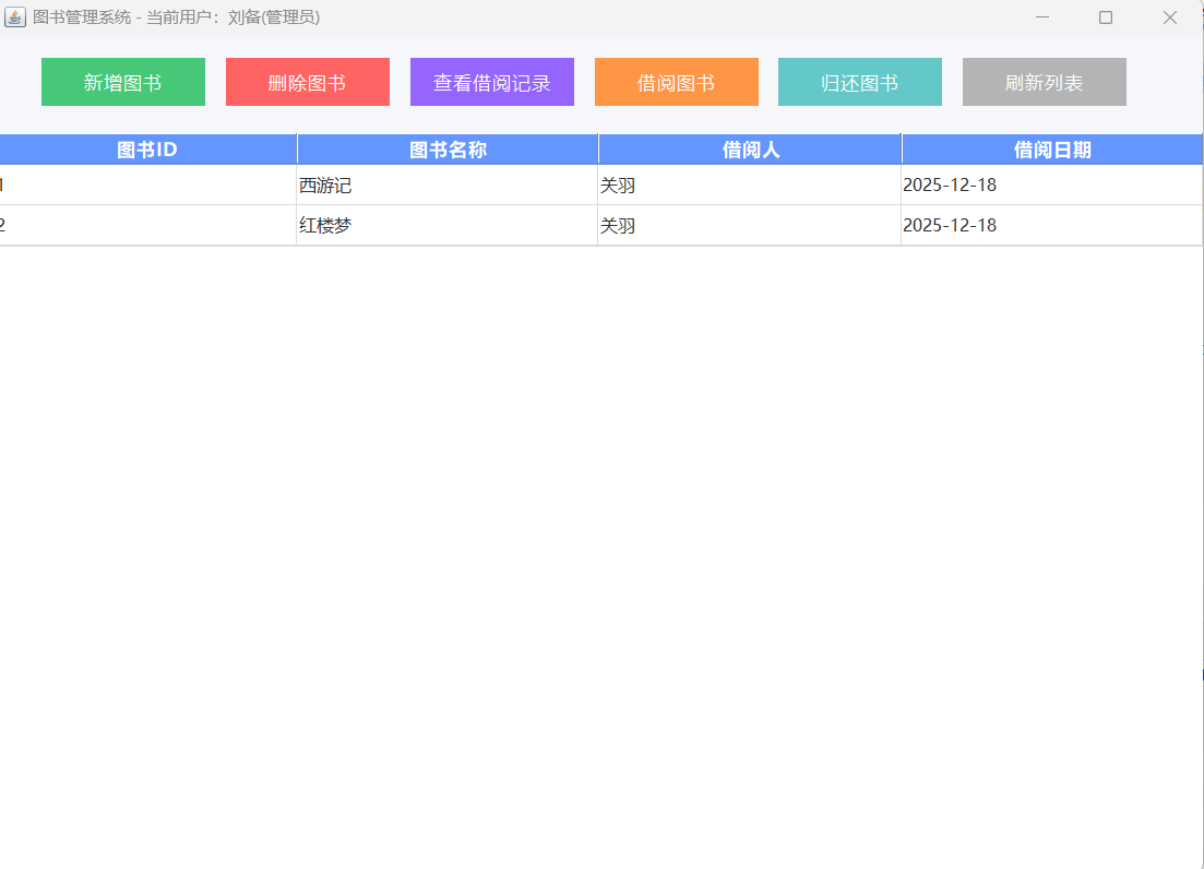 | private void initMainFrame() { mainFrame = new JFrame("图书管理系统 - 当前用户:" + currentUserName + (currentUserType.equals("admin") ? "(管理员)" : "(普通用户)")); mainFrame.setSize(900, 650); mainFrame.setLocationRelativeTo(null); mainFrame.setDefaultCloseOperation(JFrame.EXIT_ON_CLOSE); mainFrame.getContentPane().setBackground(new Color(245, 247, 250)); mainFrame.setLayout(new BorderLayout(10, 10)); // 顶部功能栏 functionPanel = new JPanel(); functionPanel.setBackground(new Color(245, 247, 250)); functionPanel.setBorder(new EmptyBorder(15, 20, 10, 20)); functionPanel.setLayout(new FlowLayout(FlowLayout.LEFT, 15, 0)); // 管理员专属按钮 if (currentUserType.equals("admin")) { functionPanel.add(createStyledButton("图书上架", new Color(70, 200, 120))); functionPanel.add(createStyledButton("删除图书", new Color(255, 100, 100))); functionPanel.add(createStyledButton("查看借阅记录", new Color(150, 100, 255))); } // 公共按钮 functionPanel.add(createStyledButton("借阅图书", new Color(255, 150, 70))); functionPanel.add(createStyledButton("归还图书", new Color(100, 200, 200))); functionPanel.add(createStyledButton("刷新列表", new Color(180, 180, 180))); mainFrame.add(functionPanel, BorderLayout.NORTH); refreshTable(); // 表格初始化} |