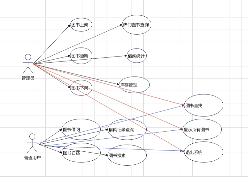 而普通用户在图书管理系统中也具备一些属于他们自己的专属操作。比如图书借阅功能,普通用户可以凭借该功能从系统中借走自己感兴趣的图书;图书归还功能,方便用户在借阅期限结束后将图书归还给系统;个人借阅记录查询功能,用户能够通过此功能查看自己以往的借阅历史;以及图书搜索功能,帮助用户精准找到自己想要借阅的图书。通过图中的线条巧妙地将不同的角色与对应的功能进行关联,能够非常清晰地区分两类用户的专属功能以及共用功能,从而明确了该图书管理系统中不同角色的权限边界,让系统的使用规则更加一目了然。