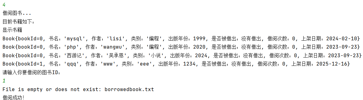 (4)系统调用封装好的数据持久化工具类中的save方法,将新增的借阅记录同步写入借阅记录文件,并将更新后的图书库存数据覆盖写入全量图书信息文件,确保所有操作数据被永久保存,避免程序重启后数据丢失。