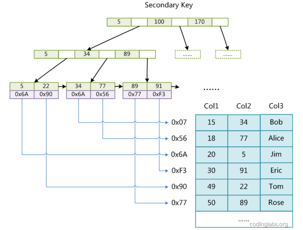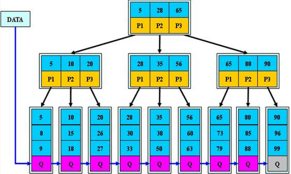 - 叶子节点 [5, 8, 9] 、 [10, 15, 18]和[20, 26, 27] 等:存储关键字和对应数据,通过链表串联,链表顺序为 5→8→9→10→15→18→......→99。