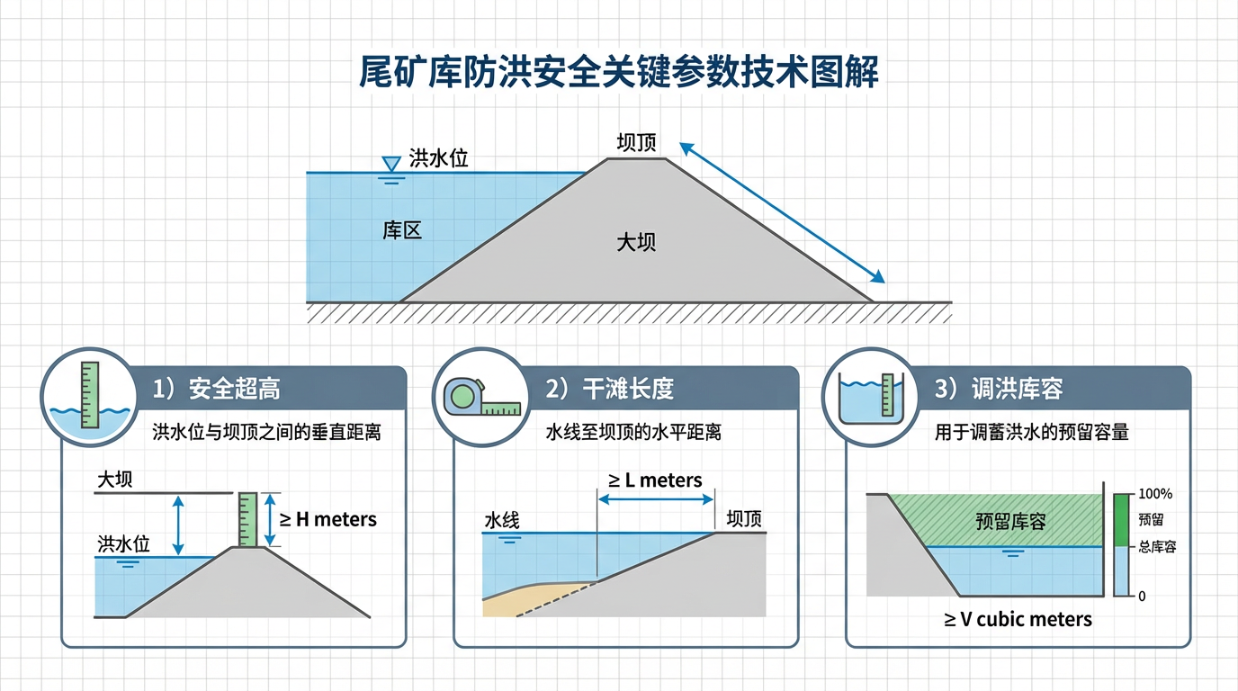 - 干滩长度 :尾矿水边线至坝顶的最小水平距离。足够的干滩长度可以消耗洪水能量、沉积泥沙,并为应急抢险提供空间和时间。