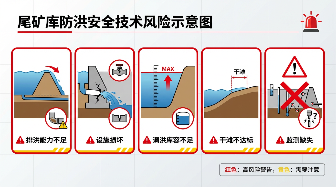 - 调洪库容不足:为多存尾矿盲目抬高水位,侵占防洪库容。