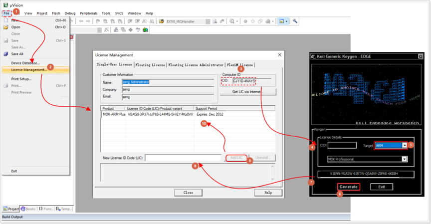 关闭杀毒软件,对Keil(keygen)进行破解(以学习为目的,禁止应用于商业行为);若粘贴CID时弹出警告,以管理员权限重新打开Keil重试。