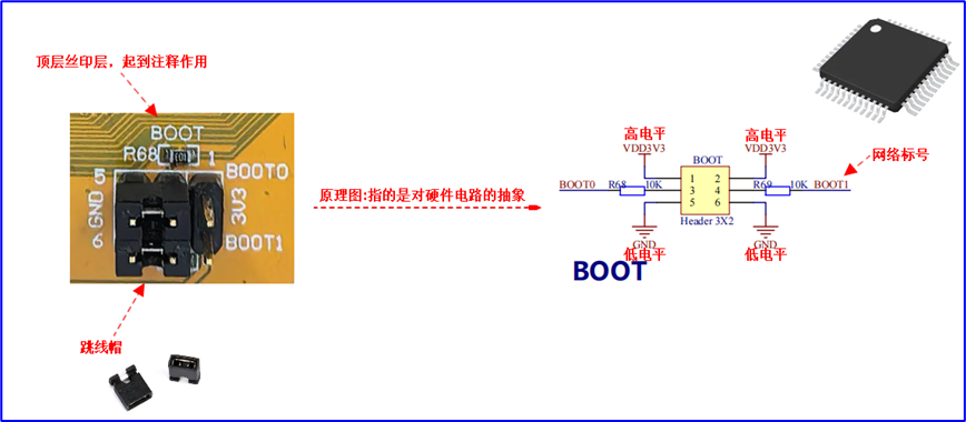 自举模式决定MCU上电后从哪个存储区域加载程序,由BOOT0和BOOT1引脚电平控制: