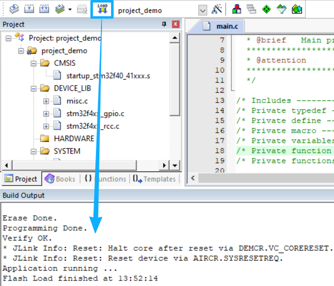 main.c中初始化外设(如GPIO、时钟),编写业务逻辑。 - 配置Debug选项后,通过J-Link烧录固件到开发板测试。