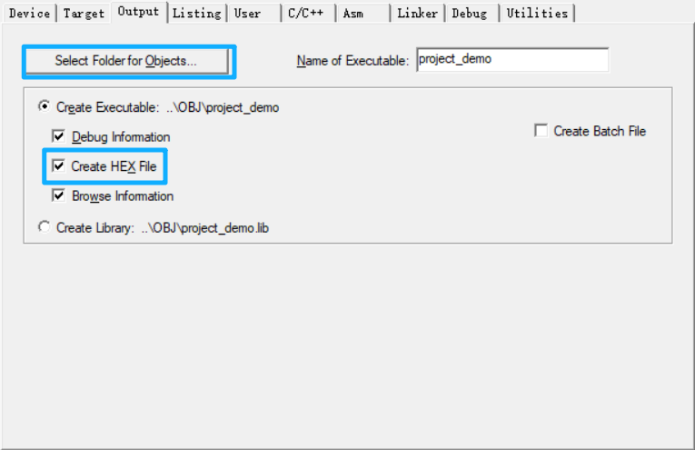 Path:设置输出文件路径为..\OBJ(工程根目录的OBJ文件夹,需手动输入或通过「Browse」选择)。Name of Executable:可修改固件名称(默认即可,最终生成.hex文件)。Create HEX File:必须勾选(生成可烧录的.hex固件文件)。- 其他选项默认(如Create Batch File、Debug Information)。