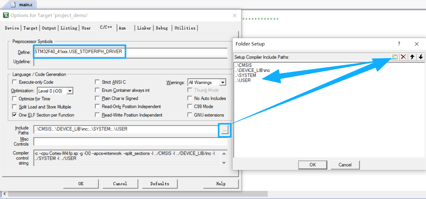 Define:输入宏定义「STM32F40_41xxx,USE_STDPERIPH_DRIVER」(英文逗号分隔),作用:STM32F40_41xxx:指定芯片系列,匹配对应的寄存器定义。USE_STDPERIPH_DRIVER:启用标准外设库驱动。