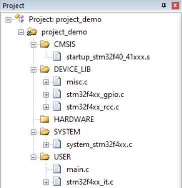 USER文件夹下的main.c、stm32f4xx_it.c、stm32f4xx_conf.h。 - 「HARDWARE」分组:暂为空,后续添加用户自定义驱动。