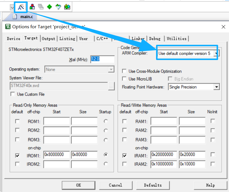 ARM Compiler:选择「Use default compiler version 5」。