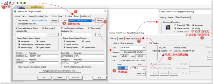 工程配置:打开Keil工程,进入"Options for Target"→"Debug",选择"J-LINK/J-TRACE Cortex";点击"Settings",确认芯片型号匹配,配置Port(SW)和自动复位。