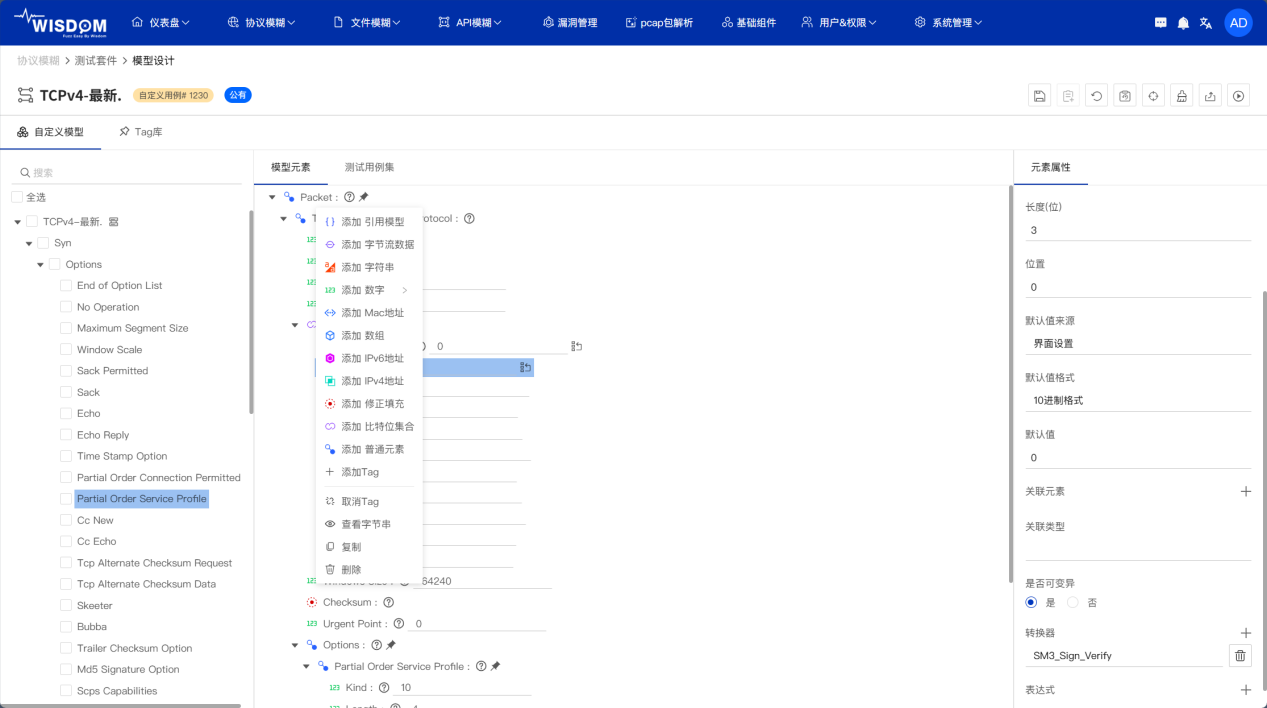 针对低空领域大量的私有协议,Wisdom 提供了强大的可视化自定义功能。测试人员无需编写复杂的代码,通过图形化界面即可对私有协议的数据结构进行建模。系统支持定义字段类型、默认值、约束条件,并能配置校验和(Checksum)、哈希(Hash)、加密/解密等高级处理逻辑。这种灵活的建模能力,使得 Wisdom 能够快速适应不同厂商的私有技术栈。