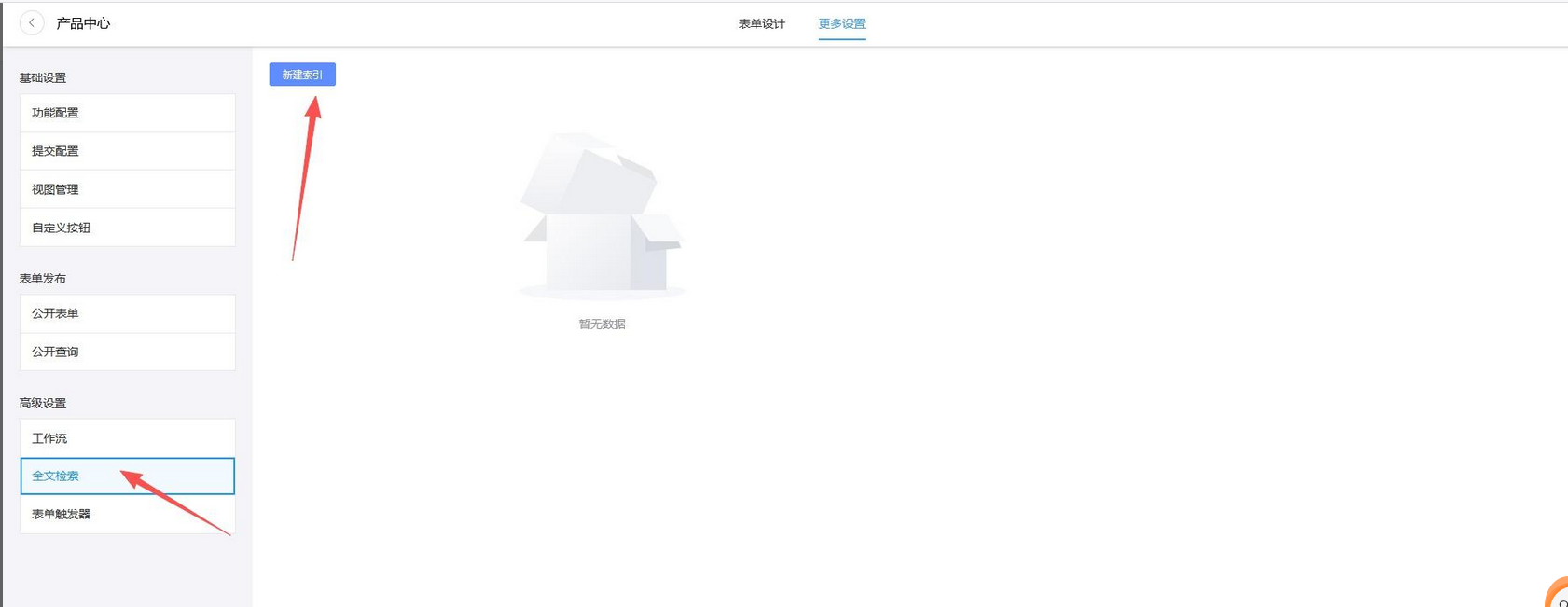 1、进入表单管理后台,进入对应表单的配置界面,点击全文检索,如下图