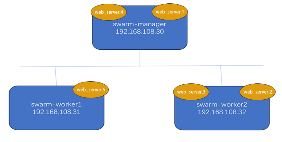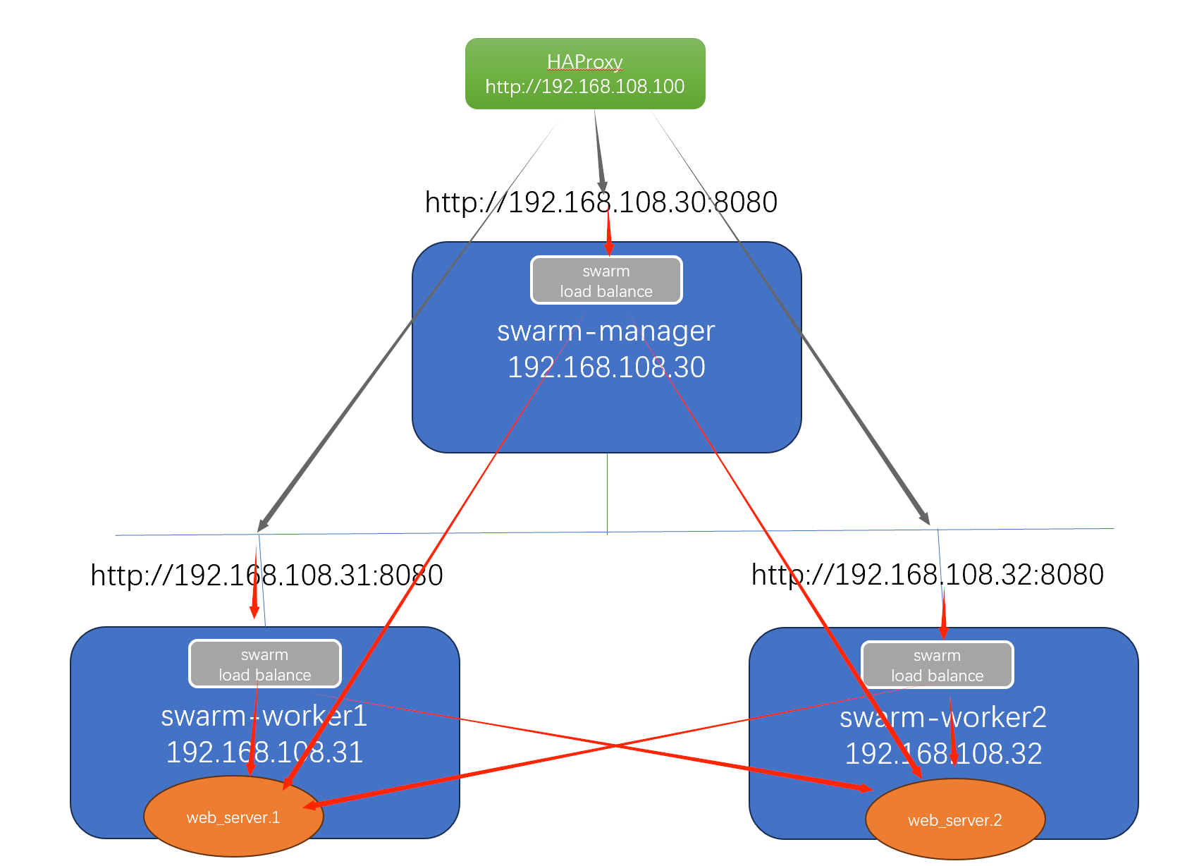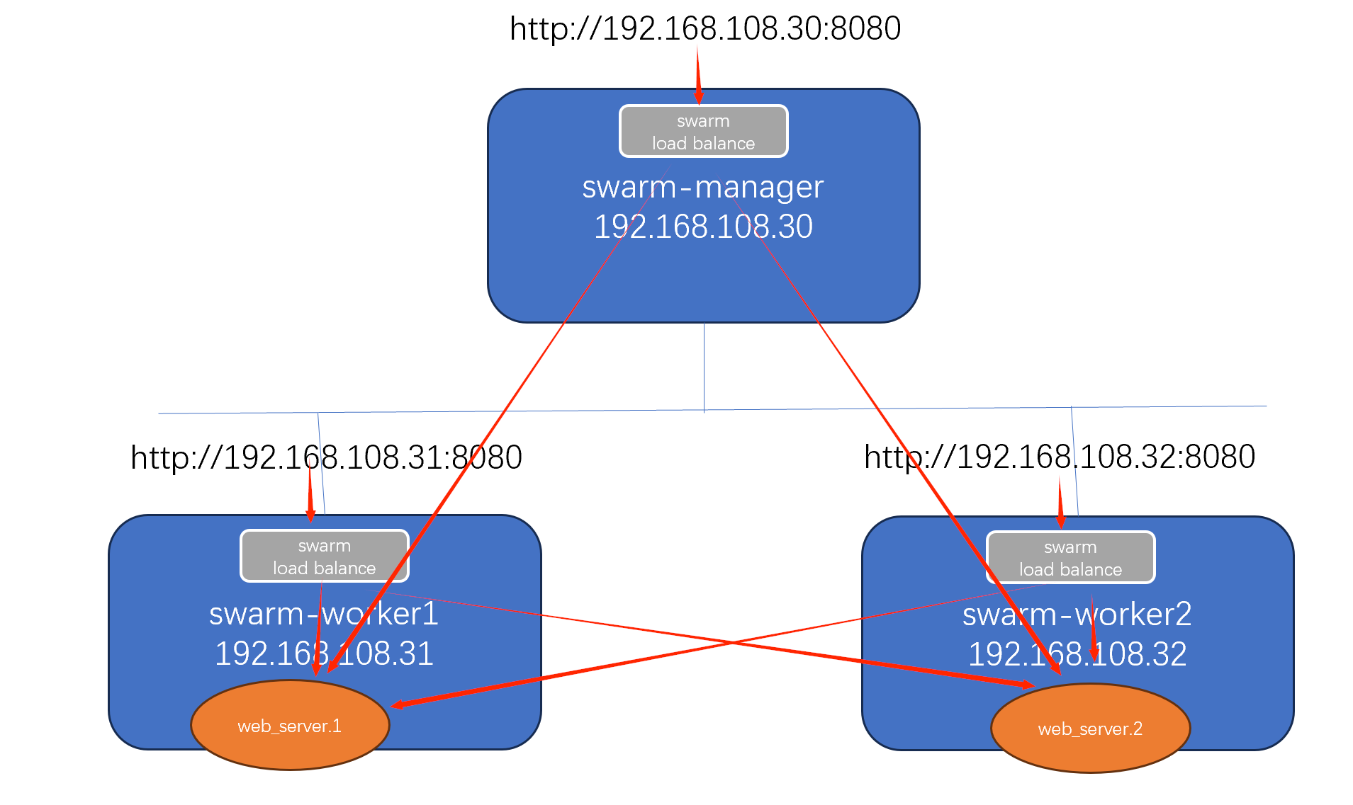 接上一节案例,当我们访问任何节点的 8080 端口时,swarm 内部的 load balancer 会将请求转发给 web_server 其中的一个副本。