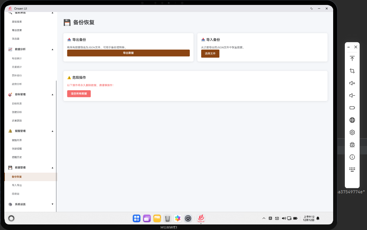 当用户点击备份按钮时,应用会收集所有需要备份的数据,包括记录、目标、提醒等。应用会将数据序列化为 JSON 格式。