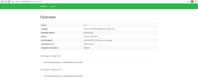 查看Secondarynamenode页面,浏览器输入访问http://10.100.20.55:50090界面