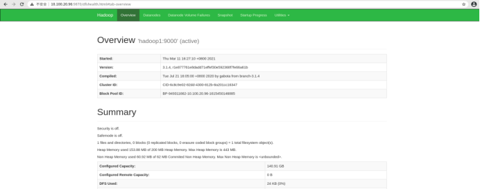 查看HDFS页面,浏览器输入访问http://10.100.20.96:9870